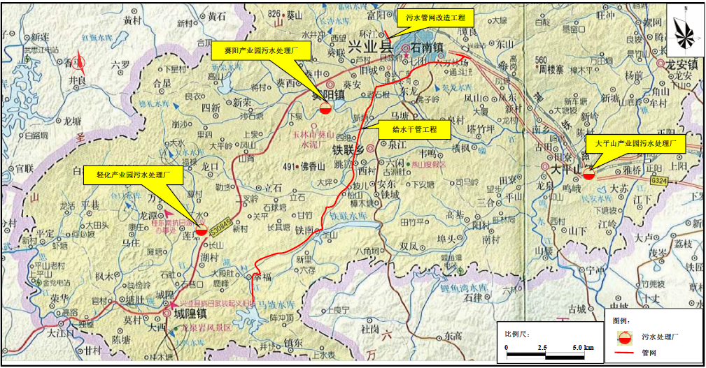 建设地点:广西玉林市兴业县大平山产业园、葵阳产业园和城隍轻化产业园、石南镇等,城区污水管网实施地点位于兴业县城。项目建设地址见图。